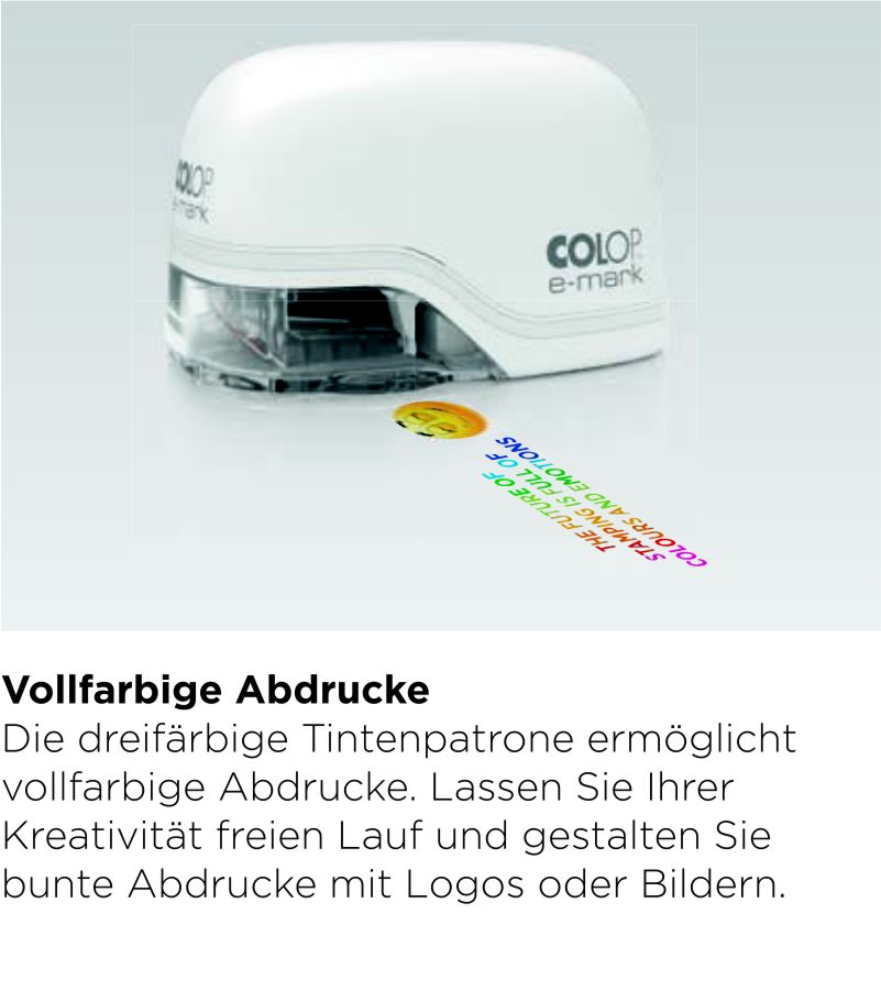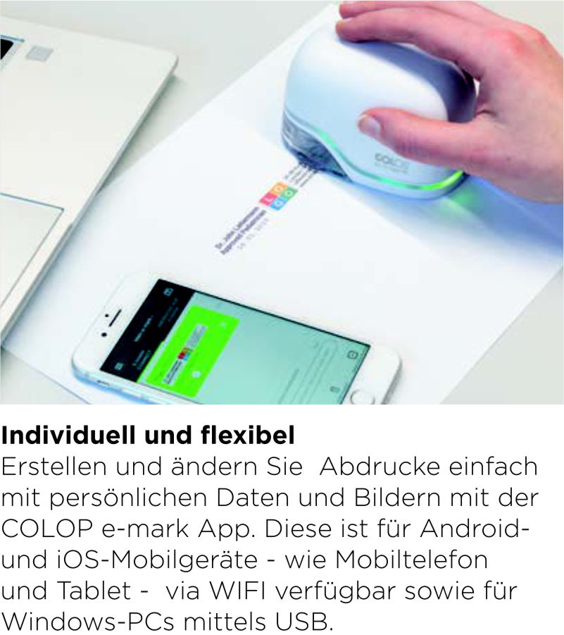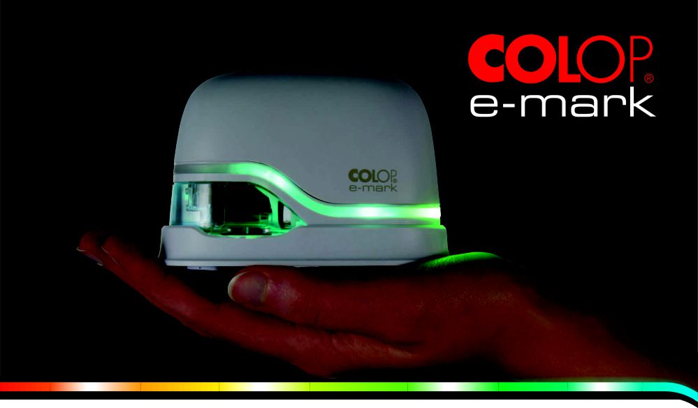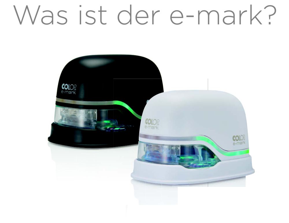 Der e-mark ist ein elektronisches und mobiles Markierungsgerät mit dem eigene Abdrucke mittels einer App auf einem mobilen Endgerät oder PC erstellt, geändert und mit einer einfachen Seitwärtsbewegung vollfarbig gestempelt werden können.