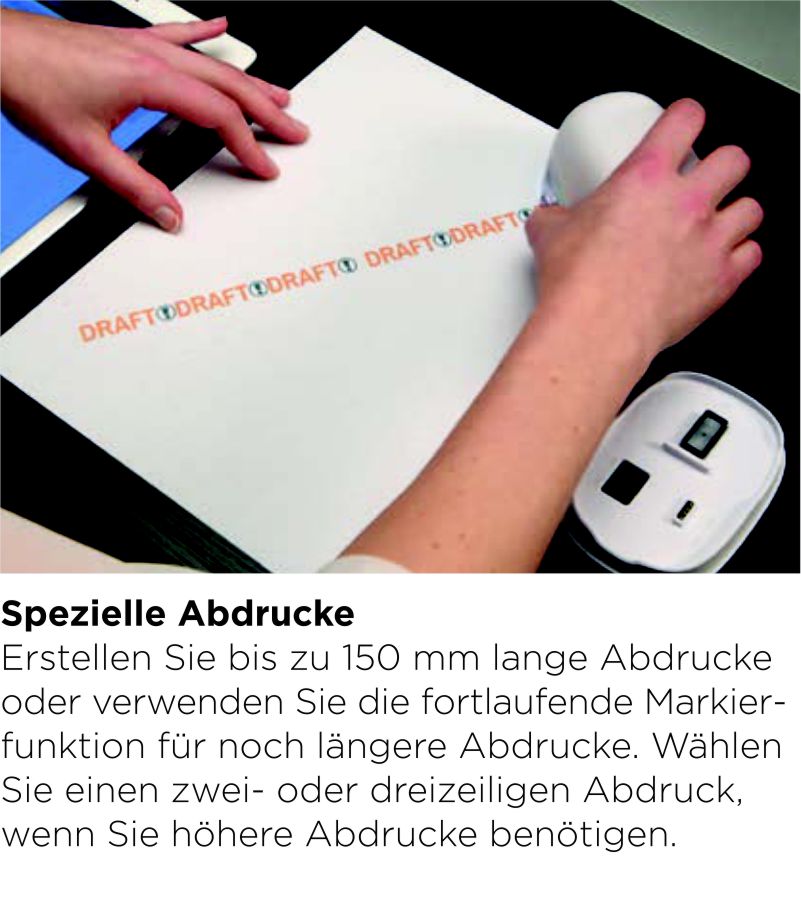 Einfach unterwegs verwendbar. Dank eingebautrem Akku ist der e-mark vielseitig einsetzbar - ob im Büro, im Garten oder bei Ihrer nächsten Geschäftsreise. Speichern Sie bis zu vier Abdrucke dauerhaft auf dem Gerät und verwenden Sie ihn auch ohne Software. Tippen Sie auf den e-mark um zwischen den Abdrucken zu wechseln.