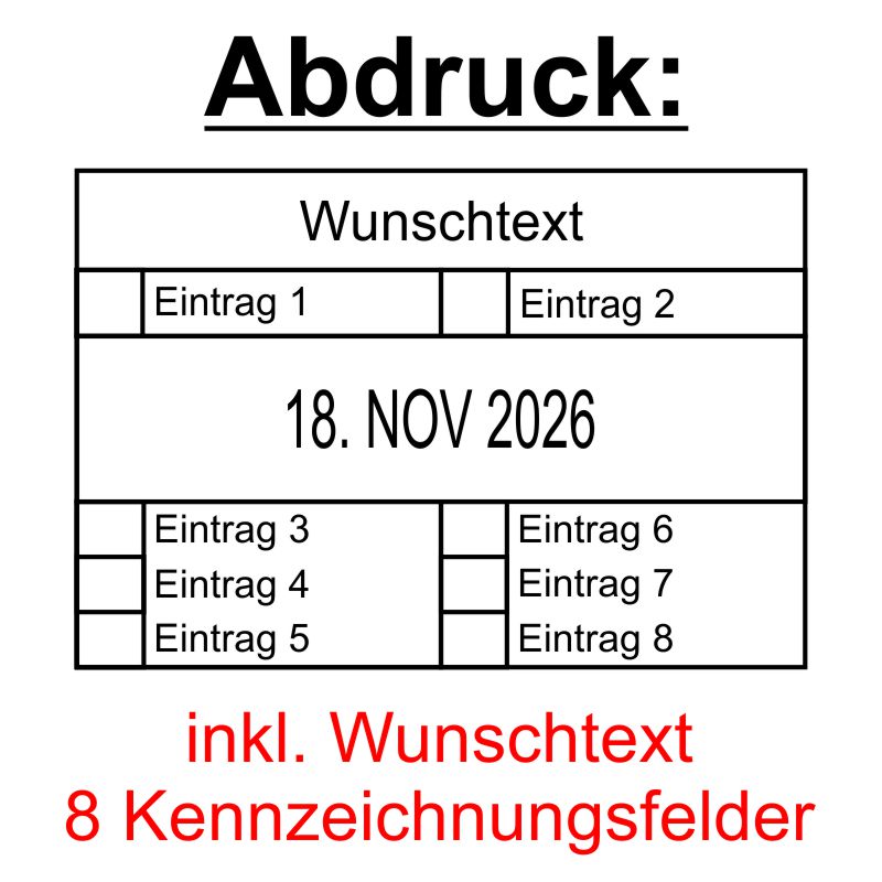 Bitte beachten Sie, dass bei diesem Umlaufstempel nur Platz ist für max. vier Zeichen je Kürzel. Schrifthöhe des Datums: 4 mm Abdruckfläche: ca. 67x46mm.